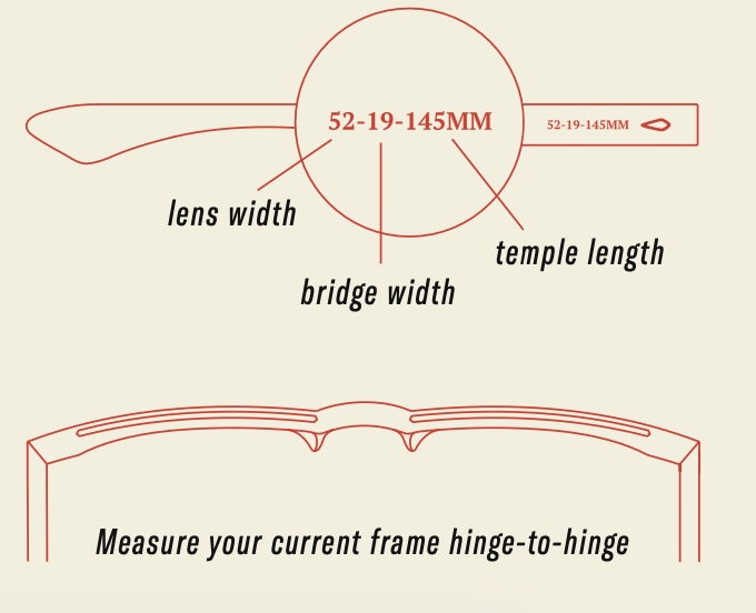 They are usually written on the inside of the temple arm. If not, the hinge-to-hinge width can be measured with a ruler.