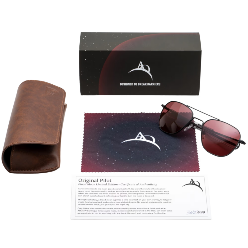 Les verres AOLite™ SunVogue Deep Wine, inspirés de la teinte rouge de la Lune de sang avec logo AO éclipsé gravé dans le coin du verre.
