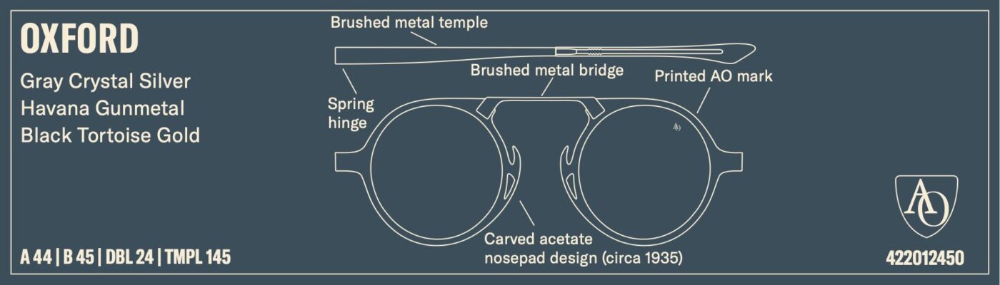 Difficile à croire, mais ce modèle à l’allure résolument moderne s’inspire d’une monture AO lancée en 1935. L’Oxford allie le meilleur des deux mondes : une inspiration vintage et une fabrication américaine moderne. Ses finitions métalliques brossées, son pont original et ses plaquettes de nez artisanales créent un style qui traverse les époques.
